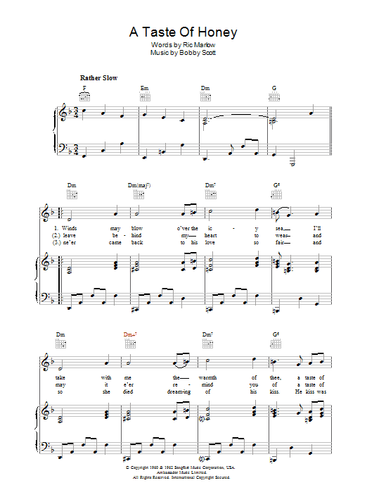 Download or print Barbra Streisand A Taste Of Honey sheet music, chords and digital score arranged for Piano, Vocal & Guitar Chords. This Pop score includes 3 page(s).