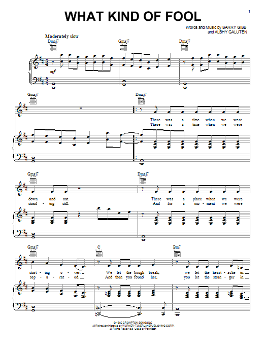 Download or print Barbra Streisand & Barry Gibb What Kind Of Fool sheet music, chords and digital score arranged for Piano, Vocal & Guitar Chords (Right-Hand Melody). This Pop score includes 5 page(s).