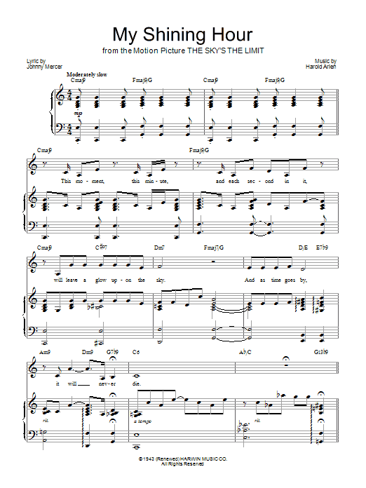 Download or print Barbra Streisand My Shining Hour sheet music, chords and digital score arranged for Piano, Vocal & Guitar Chords (Right-Hand Melody). This Jazz score includes 4 page(s).