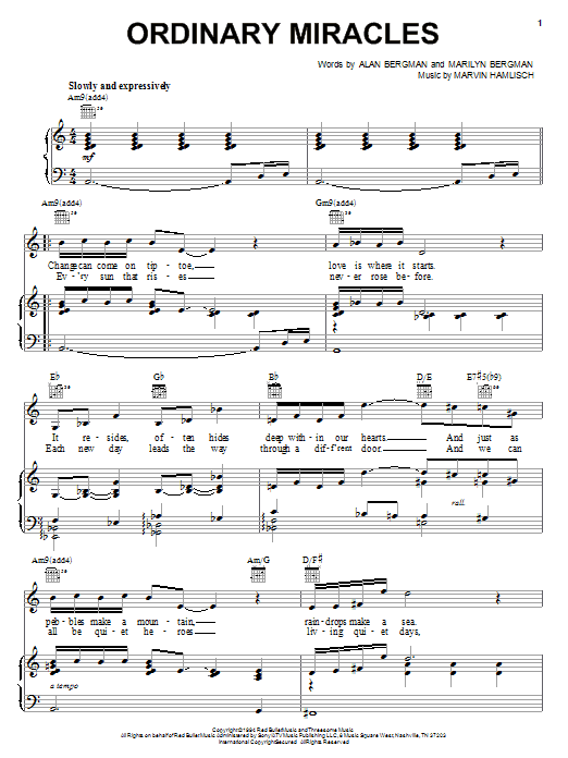 Download or print Barbra Streisand Ordinary Miracles sheet music, chords and digital score arranged for Piano, Vocal & Guitar Chords (Right-Hand Melody). This Pop score includes 5 page(s).