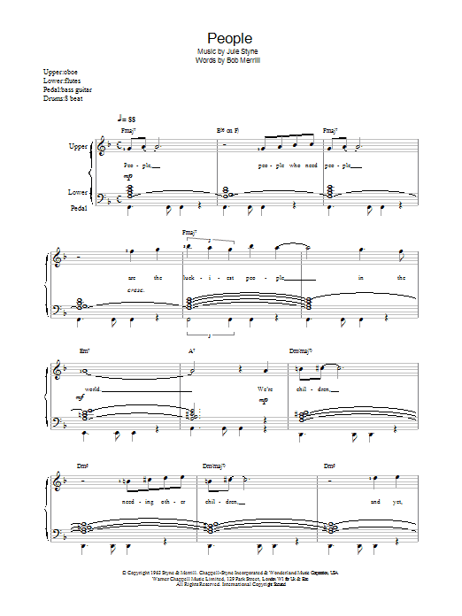 Download or print Barbra Streisand People sheet music, chords and digital score arranged for Easy Piano. This Jazz score includes 4 page(s).