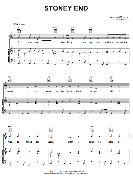 Download or print Barbra Streisand Stoney End sheet music, chords and digital score arranged for Piano, Vocal & Guitar Chords (Right-Hand Melody). This Country score includes 4 page(s).