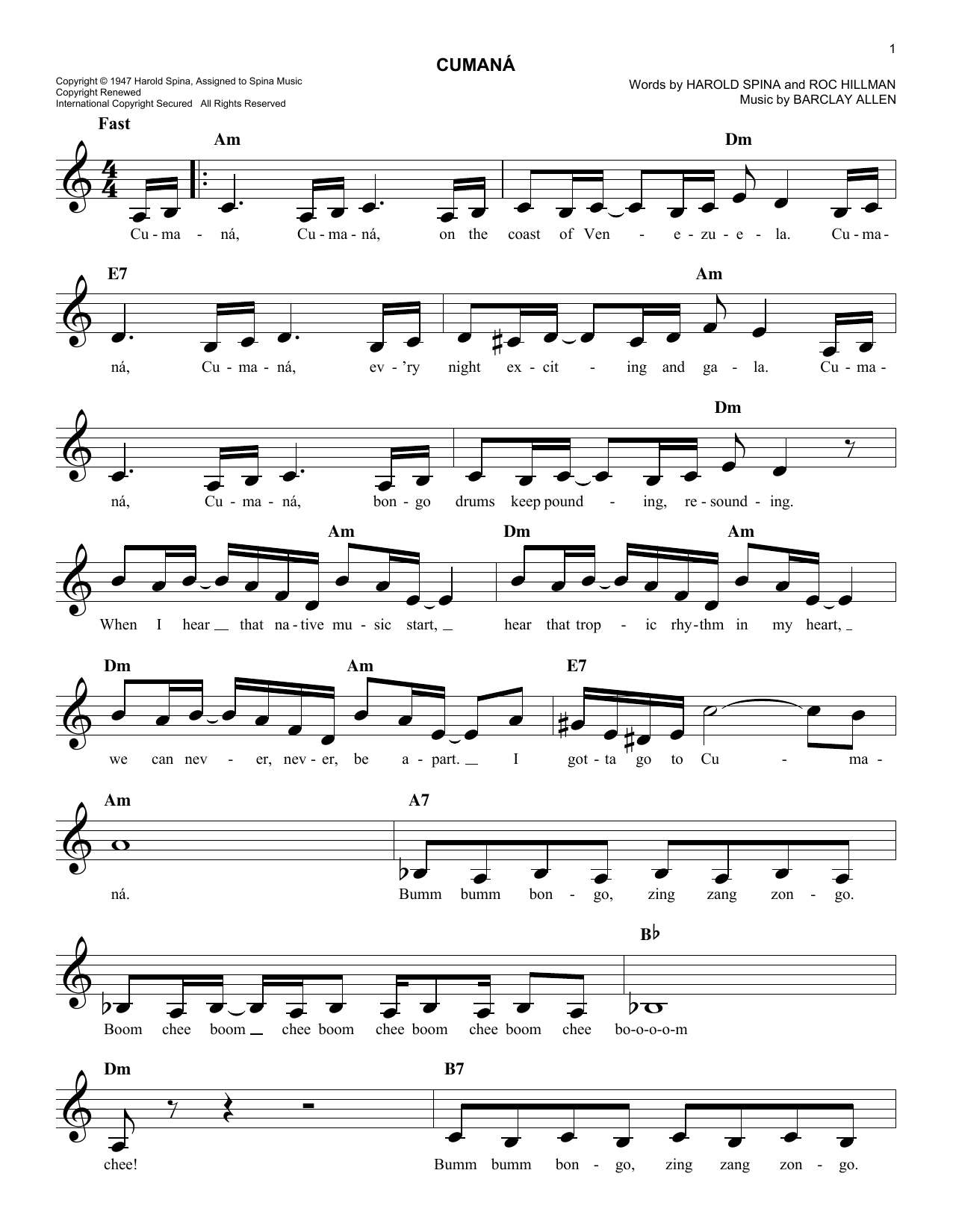 Download or print Barclay Allen Cumana sheet music, chords and digital score arranged for Marimba Solo. This Jazz score includes 2 page(s).