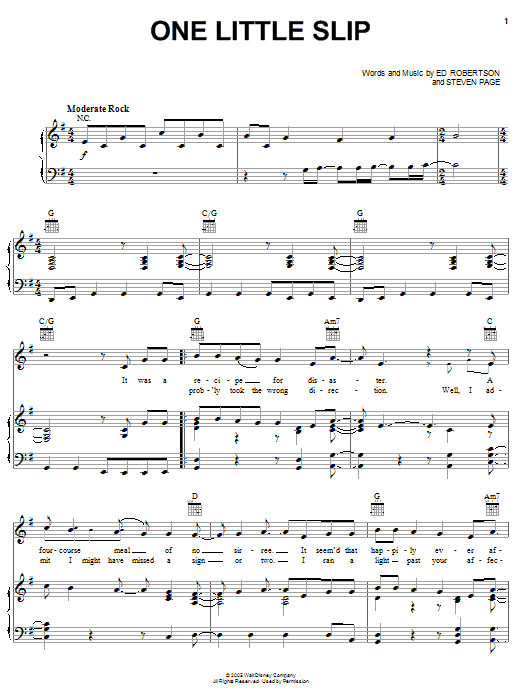 Download or print Barenaked Ladies One Little Slip sheet music, chords and digital score arranged for Piano, Vocal & Guitar Chords (Right-Hand Melody). This Disney score includes 6 page(s).