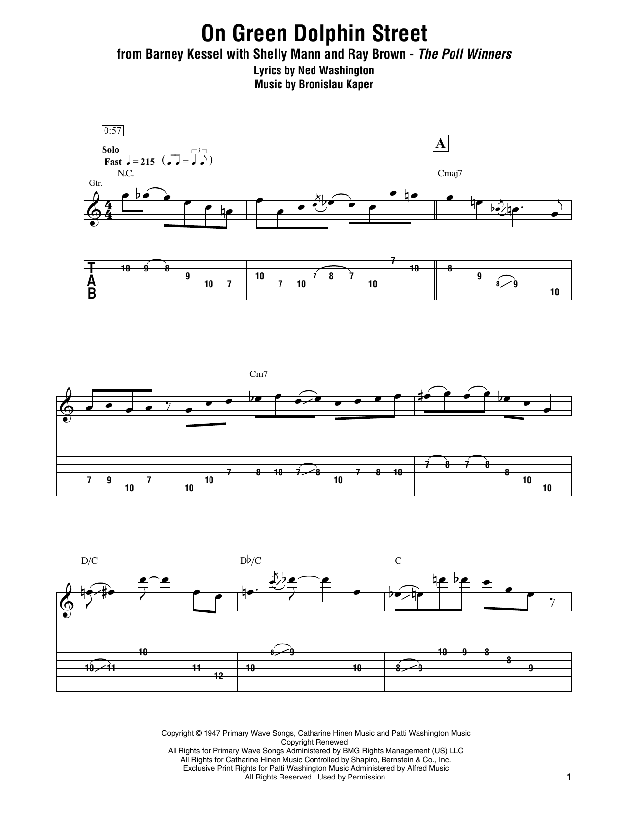 Download or print Barney Kessel, Shelly Mann and Ray Brown On Green Dolphin Street sheet music, chords and digital score arranged for Electric Guitar Transcription. This Jazz score includes 8 page(s).