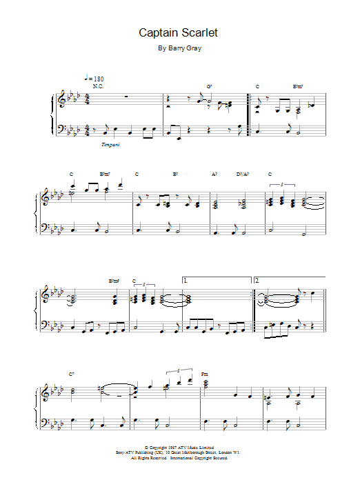 Download or print Barry Gray Captain Scarlet sheet music, chords and digital score arranged for Piano Solo. This Film/TV score includes 4 page(s).