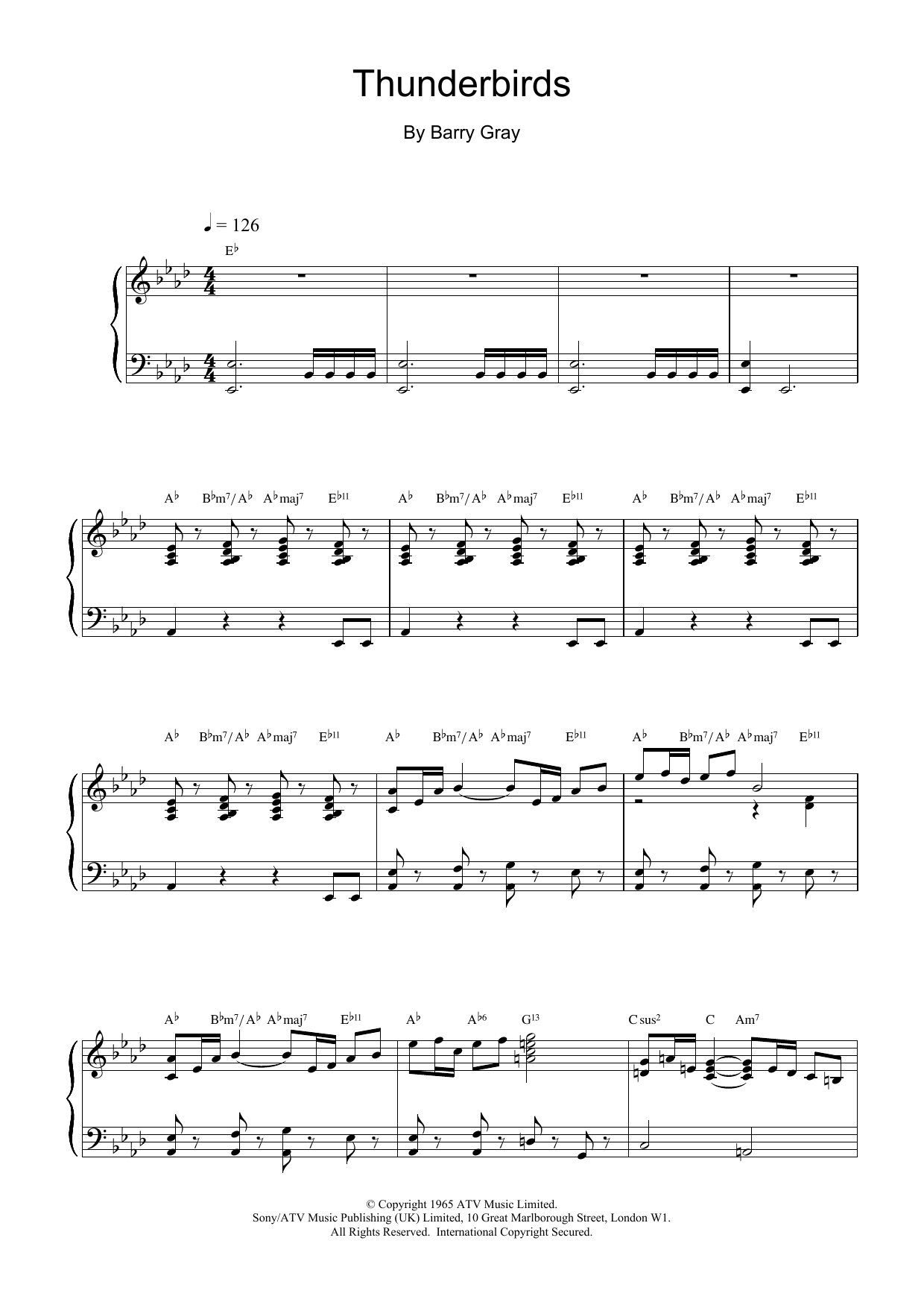 Download or print Barry Gray Thunderbirds (Main Theme) sheet music, chords and digital score arranged for Piano Solo. This Film/TV score includes 4 page(s).
