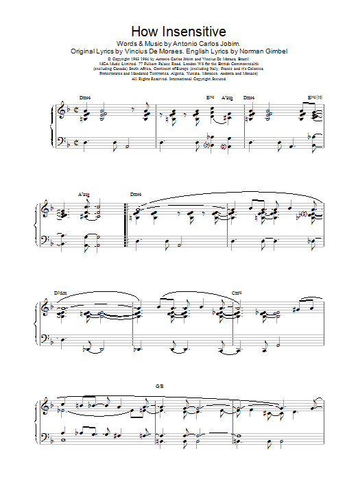 Download or print Harris,B How Insensitive sheet music, chords and digital score arranged for Piano Solo. This Jazz score includes 3 page(s).