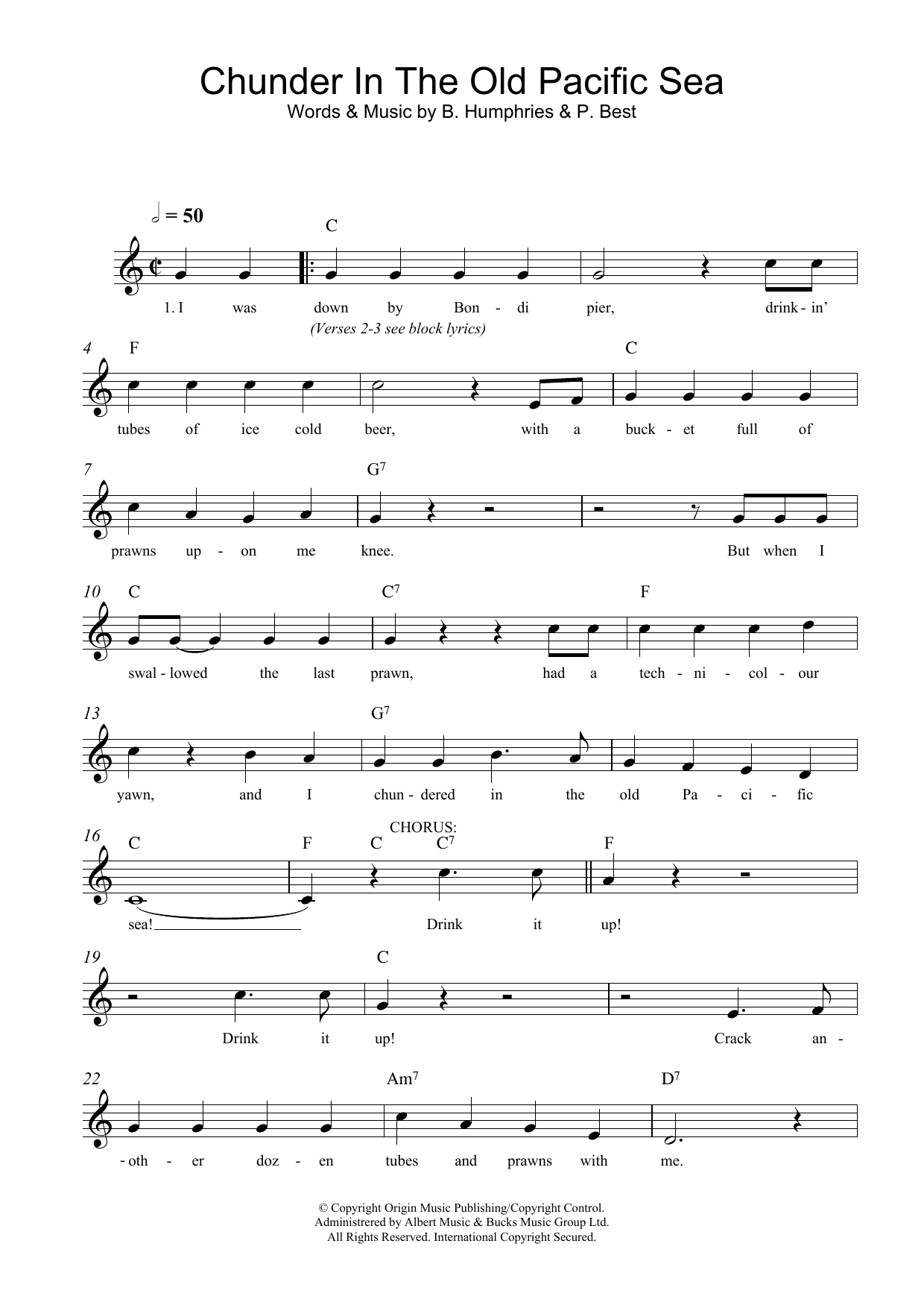 Download or print Barry Humphries Chunder In The Old Pacific Sea sheet music, chords and digital score arranged for Lead Sheet / Fake Book. This Traditional score includes 2 page(s).