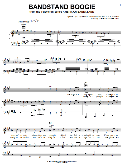 Download or print Barry Manilow Bandstand Boogie sheet music, chords and digital score arranged for Piano, Vocal & Guitar Chords (Right-Hand Melody). This Film/TV score includes 8 page(s).