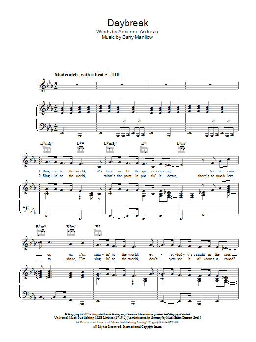 Download or print Barry Manilow Daybreak sheet music, chords and digital score arranged for Piano, Vocal & Guitar Chords. This Pop score includes 3 page(s).