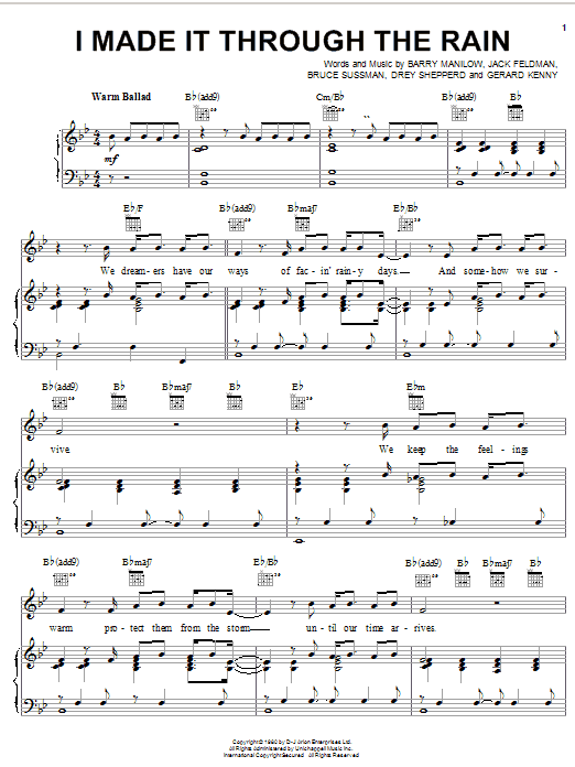 Download or print Barry Manilow I Made It Through The Rain sheet music, chords and digital score arranged for Piano, Vocal & Guitar Chords (Right-Hand Melody). This Country score includes 5 page(s).