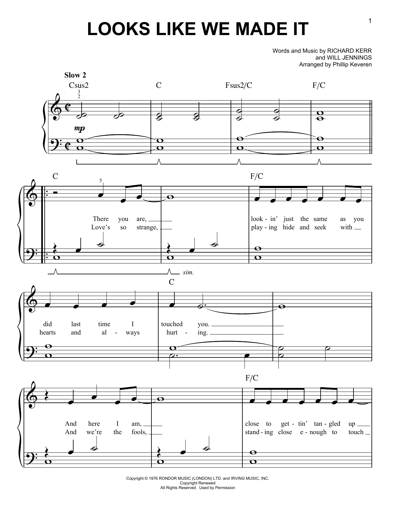 Download or print Barry Manilow Looks Like We Made It (arr. Phillip Keveren) sheet music, chords and digital score arranged for Easy Piano. This Pop score includes 5 page(s).
