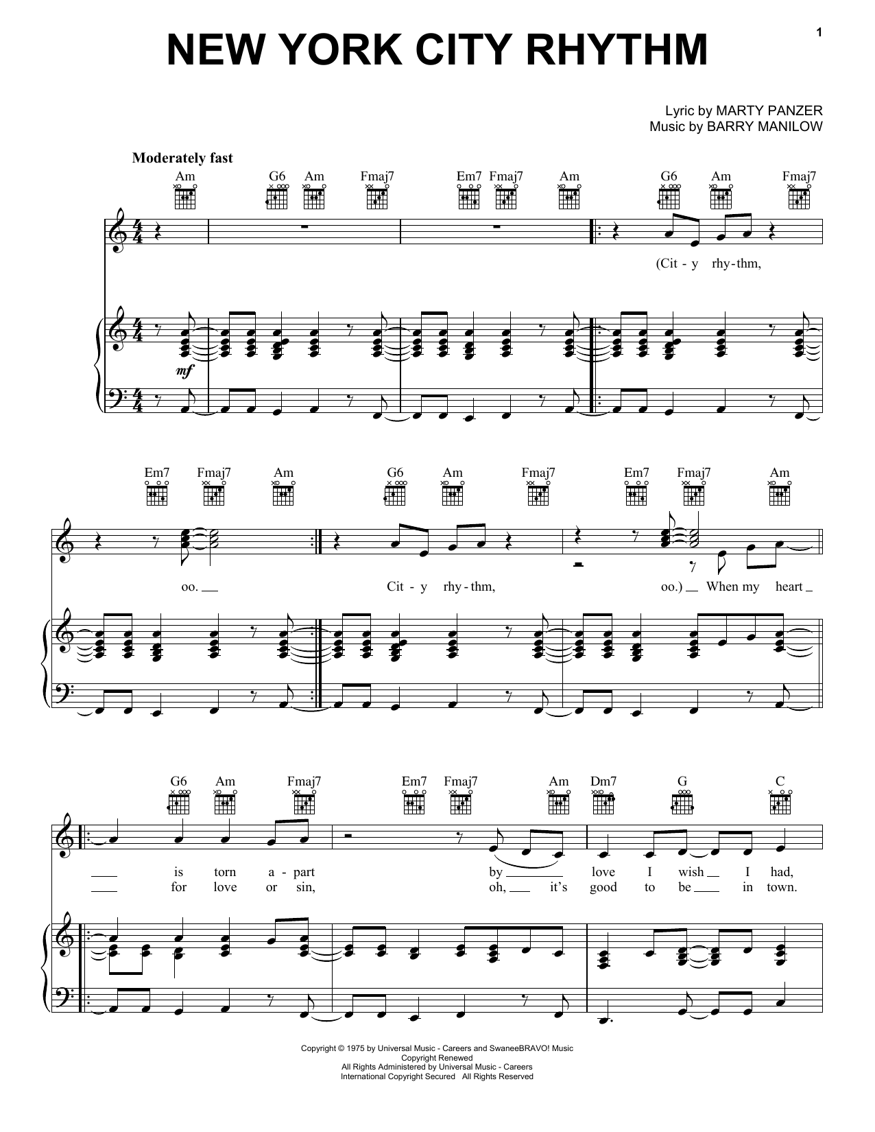Download or print Barry Manilow New York City Rhythm sheet music, chords and digital score arranged for Piano, Vocal & Guitar Chords (Right-Hand Melody). This Pop score includes 6 page(s).