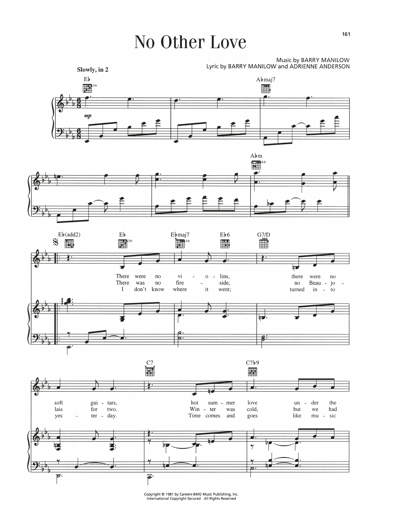 Download or print Barry Manilow No Other Love sheet music, chords and digital score arranged for Piano, Vocal & Guitar Chords (Right-Hand Melody). This Easy Listening score includes 5 page(s).