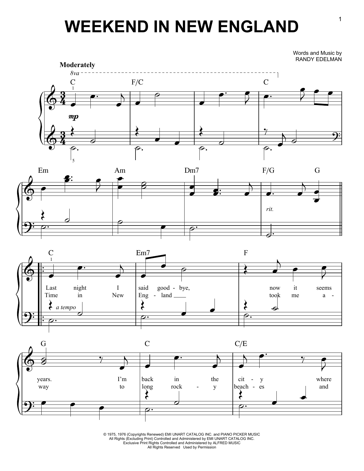 Download or print Barry Manilow Weekend In New England sheet music, chords and digital score arranged for Piano, Vocal & Guitar Chords (Right-Hand Melody). This Pop score includes 5 page(s).