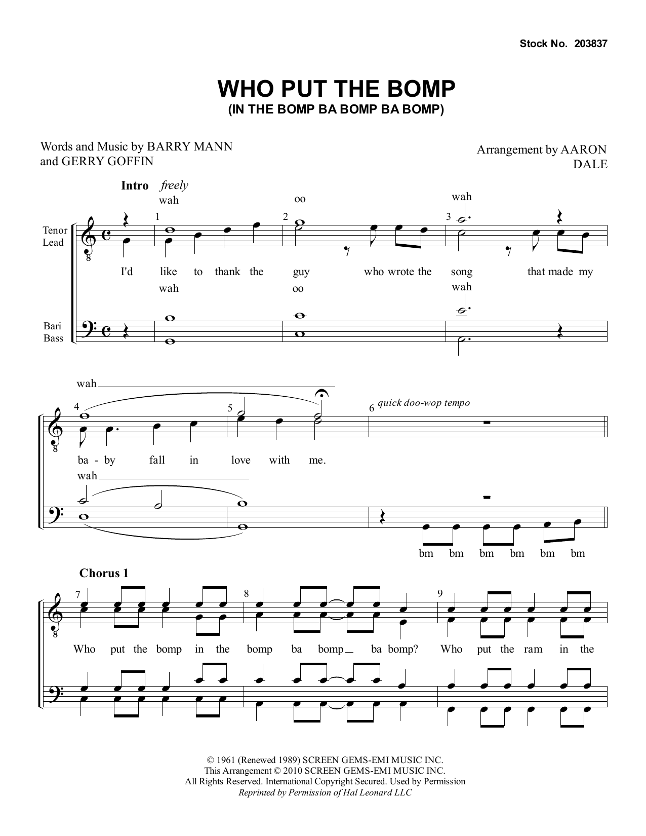 Download or print Barry Mann Who Put The Bomp (In The Bomp Ba Bomp Ba Bomp) (arr. Aaron Dale) sheet music, chords and digital score arranged for TTBB Choir. This Barbershop score includes 11 page(s).