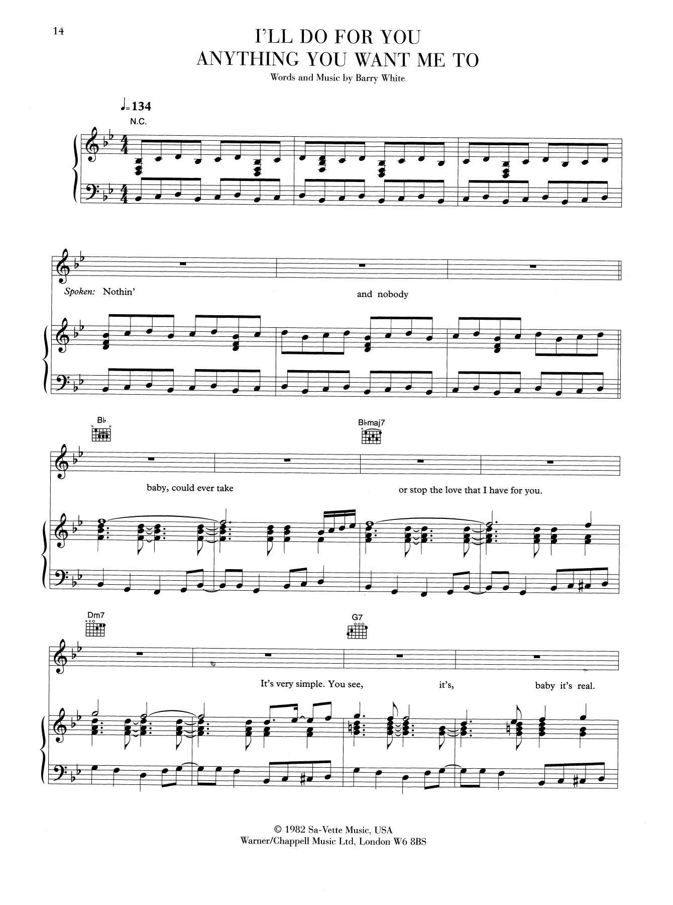 Download or print Barry White I'll Do Anything You Want Me To sheet music, chords and digital score arranged for Piano, Vocal & Guitar Chords (Right-Hand Melody). This Funk score includes 6 page(s).