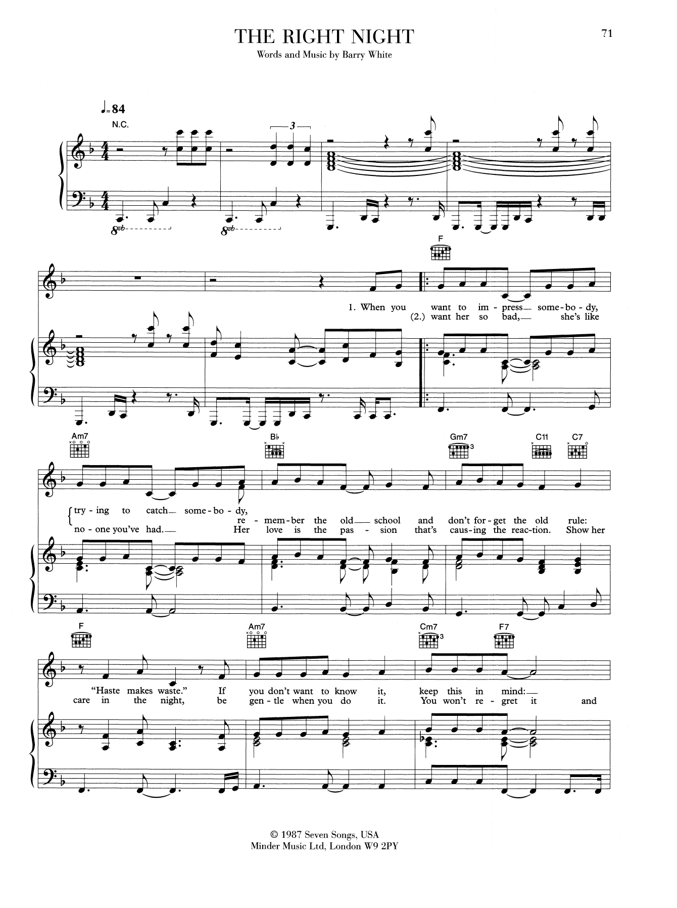 Download or print Barry White The Right Night sheet music, chords and digital score arranged for Piano, Vocal & Guitar Chords (Right-Hand Melody). This Funk score includes 5 page(s).