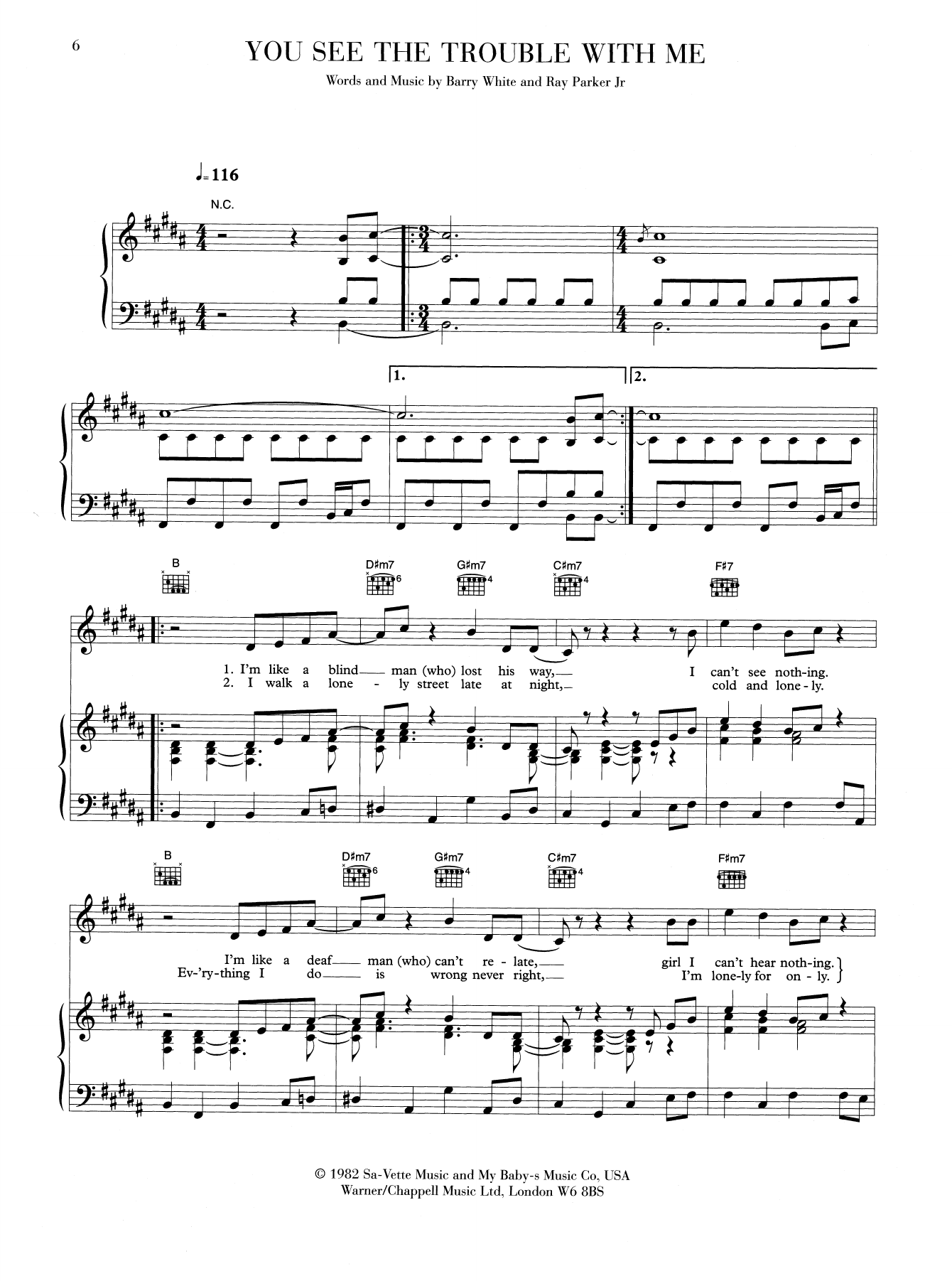 Download or print Barry White You See The Trouble With Me sheet music, chords and digital score arranged for Piano, Vocal & Guitar Chords (Right-Hand Melody). This Funk score includes 3 page(s).