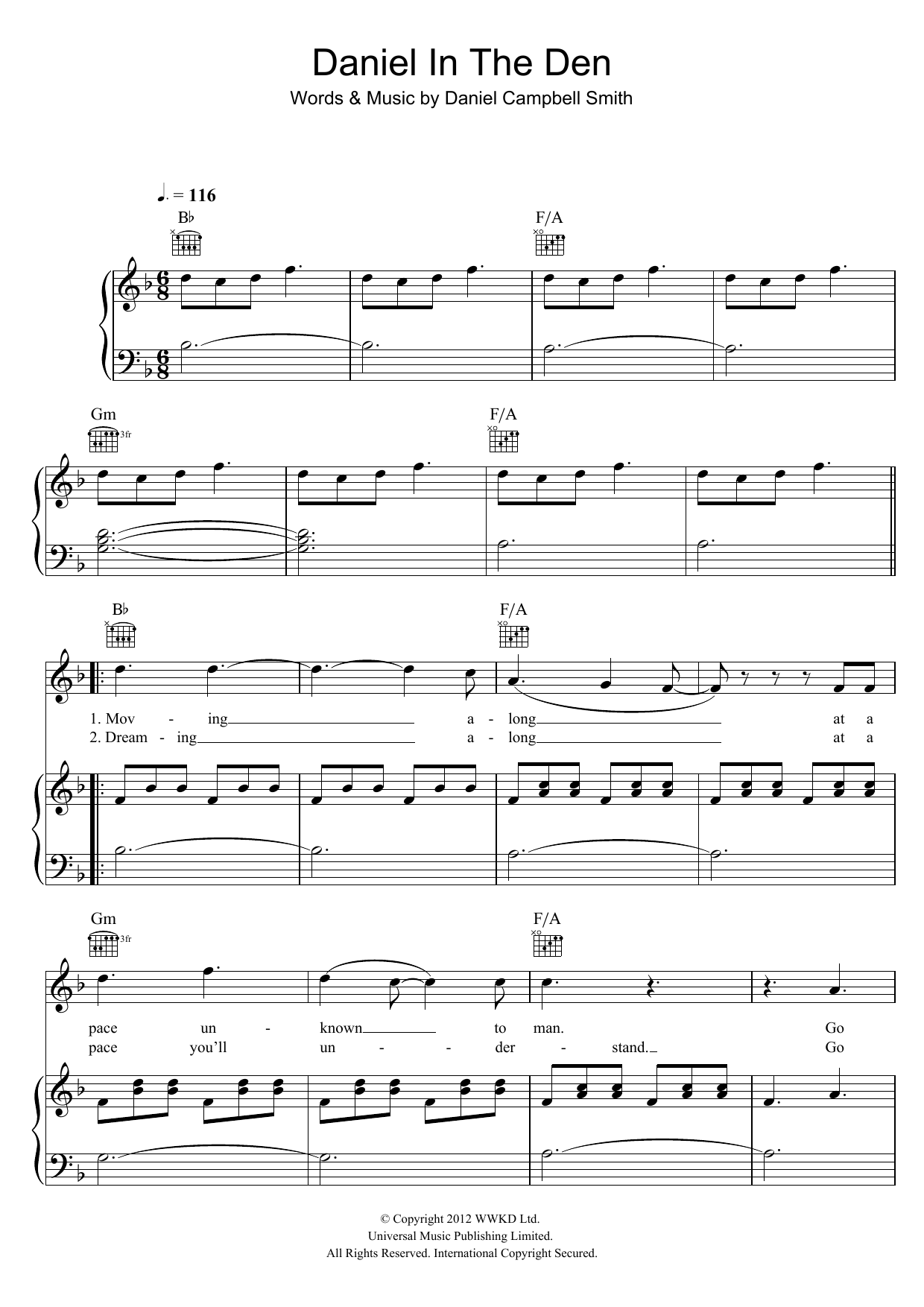 Download or print Bastille Daniel In The Den sheet music, chords and digital score arranged for Piano, Vocal & Guitar Chords. This Pop score includes 6 page(s).