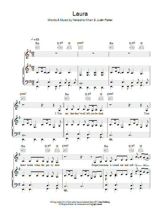 Download or print Bat For Lashes Laura sheet music, chords and digital score arranged for Piano, Vocal & Guitar Chords. This Alternative score includes 5 page(s).