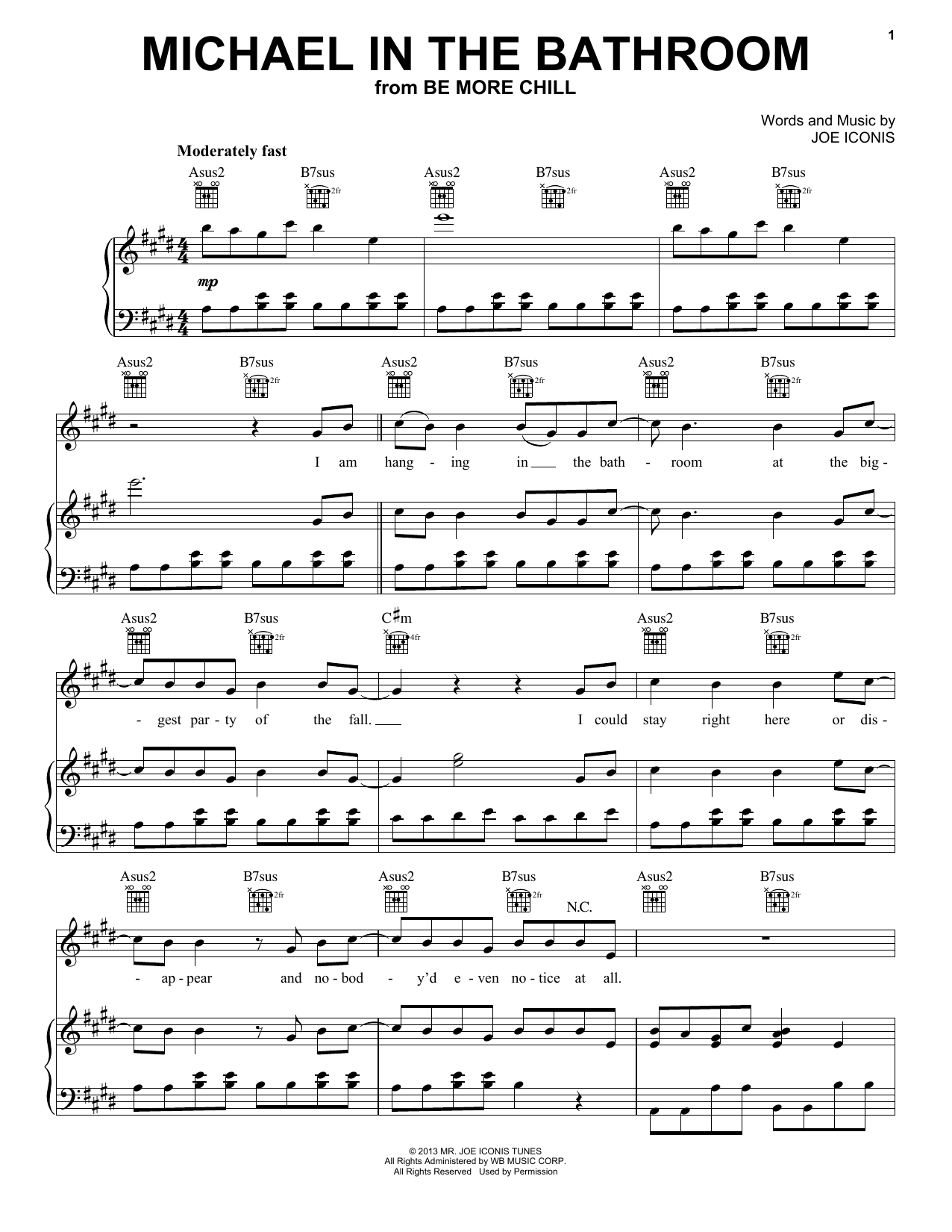 Download or print Joe Iconis Michael In The Bathroom (from Be More Chill) sheet music, chords and digital score arranged for Piano, Vocal & Guitar Chords (Right-Hand Melody). This Pop score includes 12 page(s).