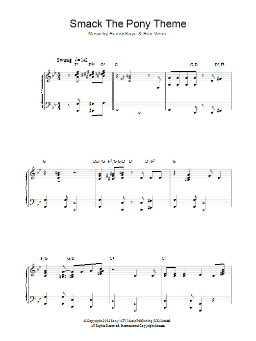 Download or print Bea Verdi Smack The Pony Theme sheet music, chords and digital score arranged for Piano Solo. This Film/TV score includes 2 page(s).