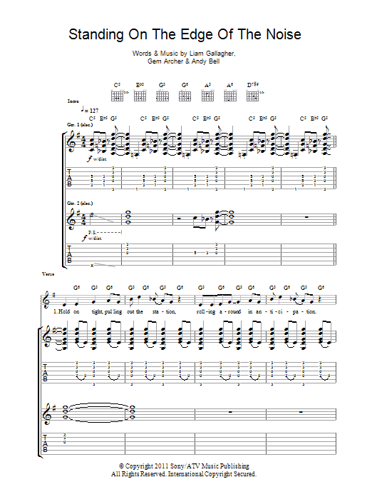 Download or print Beady Eye Standing On The Edge Of The Noise sheet music, chords and digital score arranged for Guitar Tab. This Rock score includes 7 page(s).