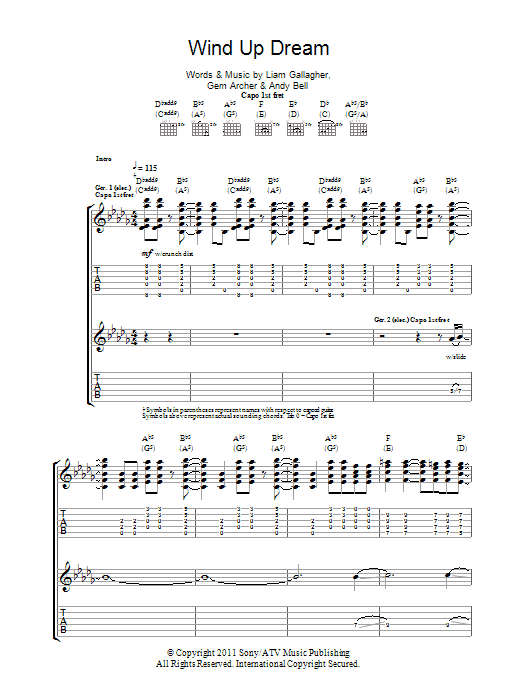 Download or print Beady Eye Wind Up Dream sheet music, chords and digital score arranged for Guitar Tab. This Rock score includes 8 page(s).