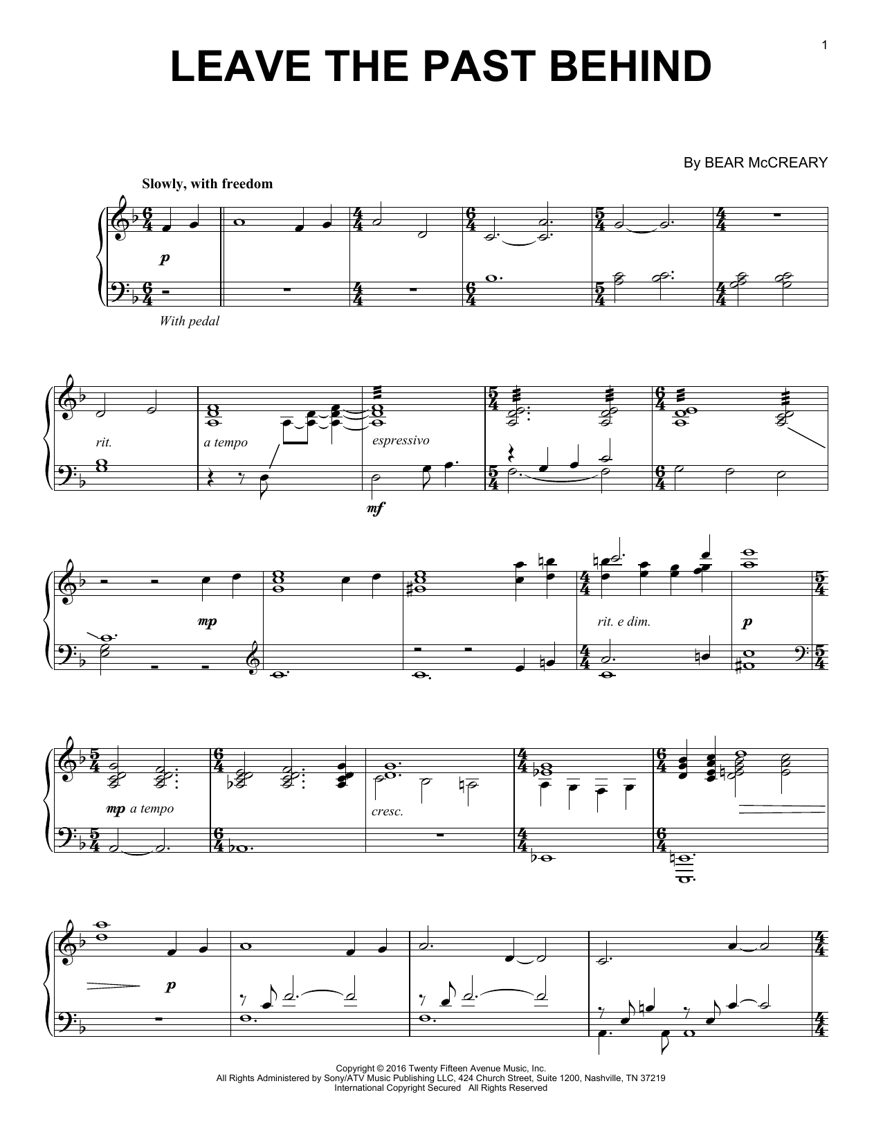 Download or print Bear McCreary Leave The Past Behind (from Outlander) sheet music, chords and digital score arranged for Piano Solo. This Film/TV score includes 3 page(s).