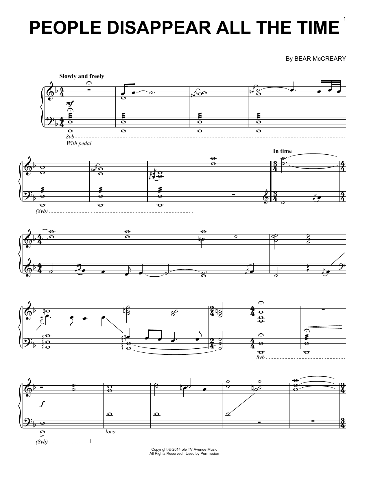 Download or print Bear McCreary People Disappear All The Time (from Outlander) sheet music, chords and digital score arranged for Piano Solo. This Film/TV score includes 3 page(s).