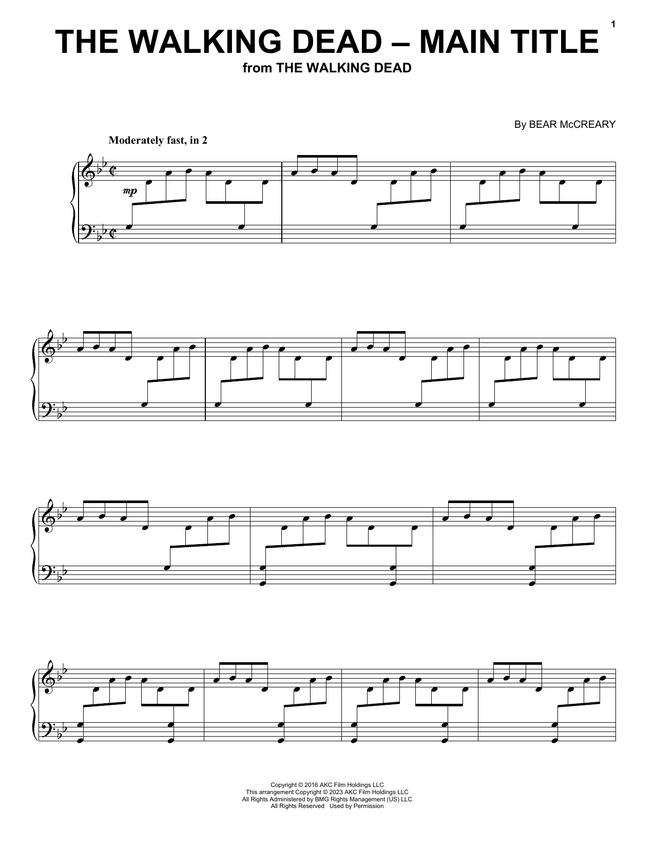 Download or print Bear McCreary The Walking Dead - Main Title sheet music, chords and digital score arranged for Piano Solo. This Film/TV score includes 2 page(s).