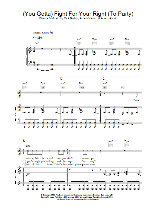Download or print Beastie Boys Fight For Your Right (To Party) sheet music, chords and digital score arranged for Lead Sheet / Fake Book. This Hip-Hop score includes 2 page(s).