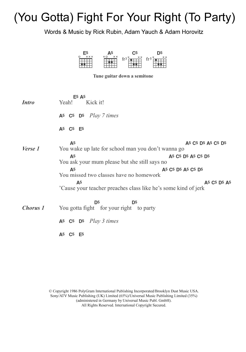 Download or print Beastie Boys (You Gotta) Fight For Your Right (To Party) sheet music, chords and digital score arranged for Guitar Chords/Lyrics. This Pop score includes 2 page(s).