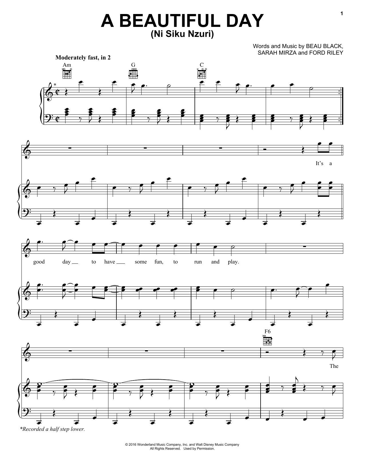 Download or print Beau Black A Beautiful Day (Ni Siku Nzuri) sheet music, chords and digital score arranged for Piano, Vocal & Guitar Chords (Right-Hand Melody). This Disney score includes 8 page(s).