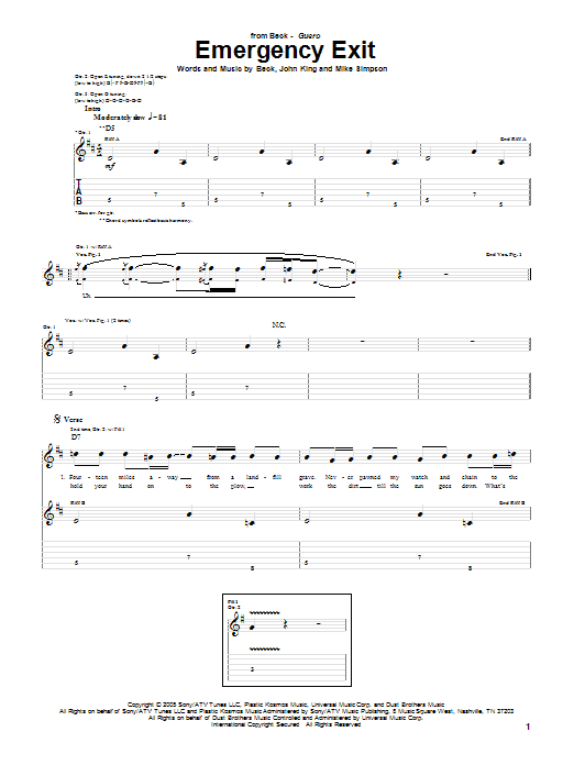 Download or print Beck Emergency Exit sheet music, chords and digital score arranged for Guitar Tab. This Pop score includes 6 page(s).