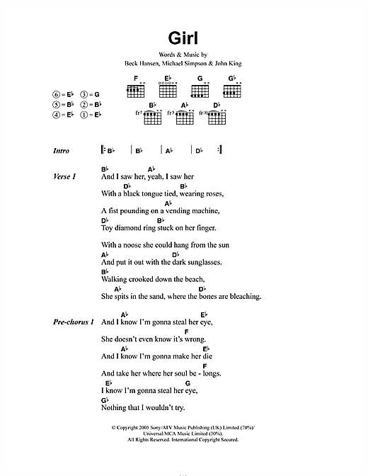 Download or print Beck Girl sheet music, chords and digital score arranged for Guitar Tab. This Pop score includes 5 page(s).