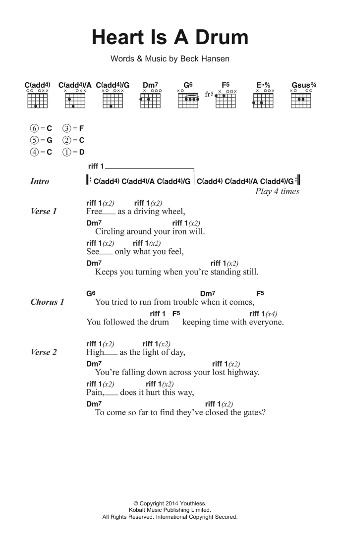 Download or print Beck Heart Is A Drum sheet music, chords and digital score arranged for Guitar Chords/Lyrics. This Rock score includes 2 page(s).