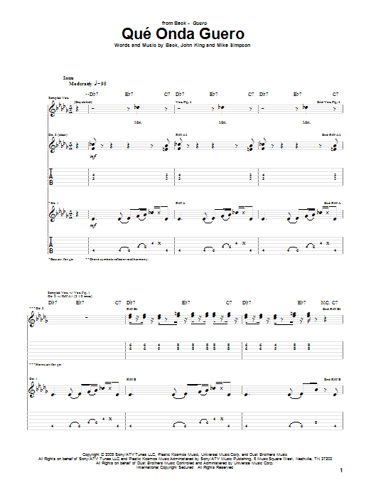 Download or print Beck Que' Onda Guero sheet music, chords and digital score arranged for Guitar Tab. This Pop score includes 6 page(s).