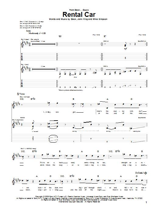 Download or print Beck Rental Car sheet music, chords and digital score arranged for Guitar Tab. This Pop score includes 5 page(s).