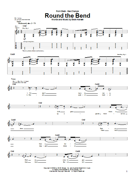 Download or print Beck Round The Bend sheet music, chords and digital score arranged for Guitar Tab. This Alternative score includes 3 page(s).