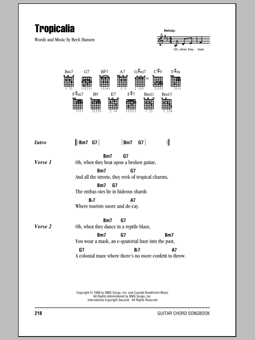 Download or print Beck Tropicalia sheet music, chords and digital score arranged for Guitar Chords/Lyrics. This Rock score includes 2 page(s).