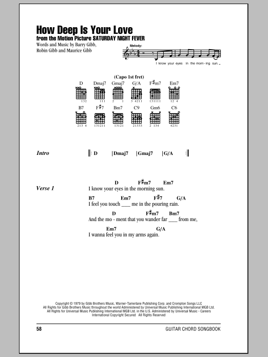 Download or print The Bee Gees How Deep Is Your Love sheet music, chords and digital score arranged for Solo Guitar. This Disco score includes 4 page(s).