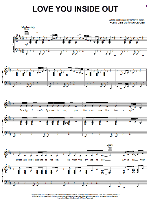 Download or print Bee Gees Love You Inside Out sheet music, chords and digital score arranged for Piano, Vocal & Guitar Chords (Right-Hand Melody). This Disco score includes 6 page(s).
