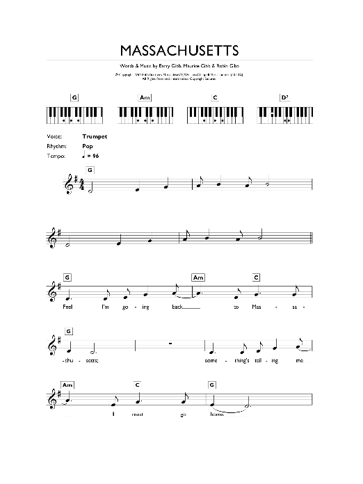 Download or print Bee Gees Massachusetts sheet music, chords and digital score arranged for Piano Chords/Lyrics. This Pop score includes 2 page(s).