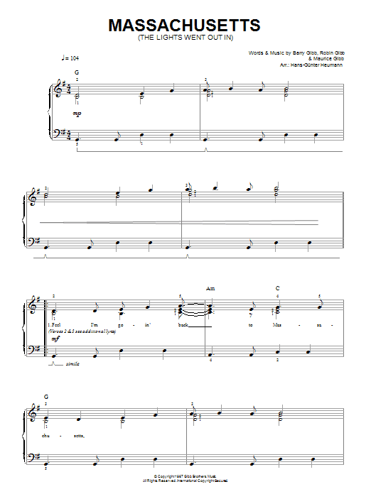 Download or print The Bee Gees Massachusetts sheet music, chords and digital score arranged for Easy Piano. This Pop score includes 4 page(s).