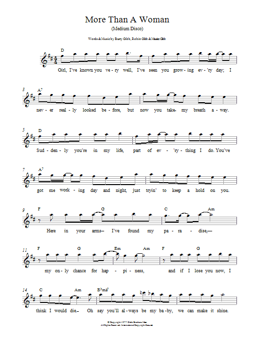 Download or print Bee Gees More Than A Woman sheet music, chords and digital score arranged for Piano, Vocal & Guitar Chords (Right-Hand Melody). This Disco score includes 4 page(s).