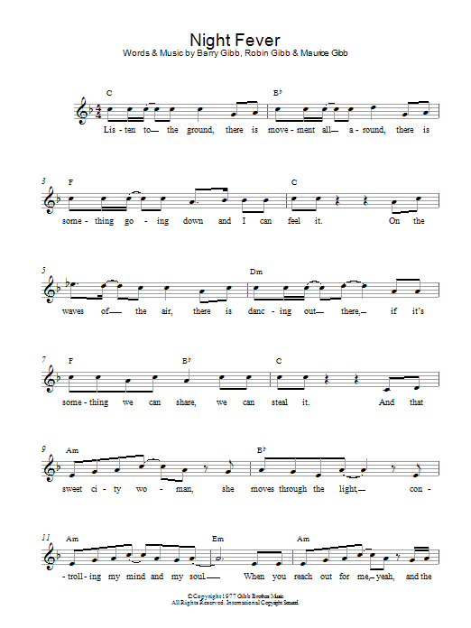 Download or print Bee Gees Night Fever sheet music, chords and digital score arranged for Lead Sheet / Fake Book. This Disco score includes 2 page(s).