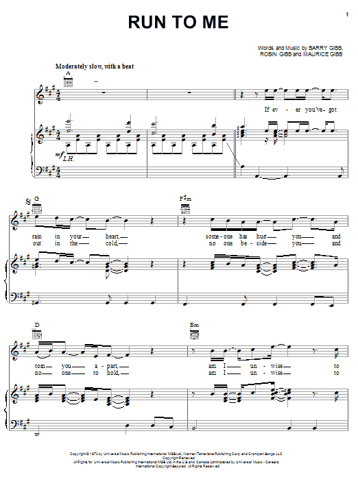 Download or print Bee Gees Run To Me sheet music, chords and digital score arranged for Guitar Chords/Lyrics. This Disco score includes 3 page(s).